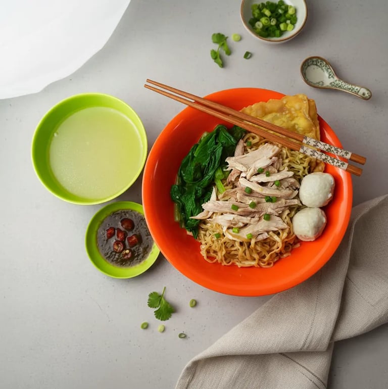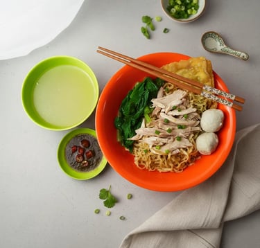 Mie dengan irisan ayam kampung yang sangat gurih dan bakso ayam serta dengan pangsit goreng yang sangat renyah