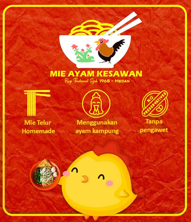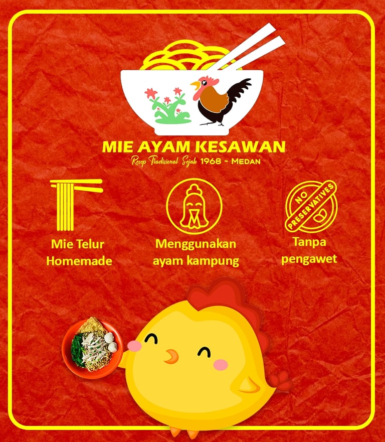 Dengan resep tradisional sejak tahun 1968, Mie Ayam Kesawan kembali membawa cita rasa yang begitu lezat dan membuat anda selalu mengingat kota Medan